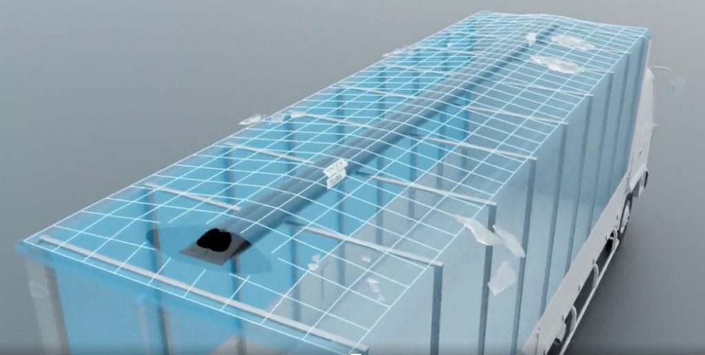| Auf dem linken Bild, sieht man ein praktisch ein existierendes Konzept, welches schon seit einigen Jahren auf dem Markt vorhanden ist. Der Schlauch unter dem Dach ist nicht neu, viele kennen bereits den Roof Saftey Airbag (kurz RSAB) oder das aus Österreich stammende AirPipe System. Der Unterschied ist hier, der TruckTollo Breaker ist portabel. Heißt, man kann ihn unter den Fahrzeugen austauschen. |